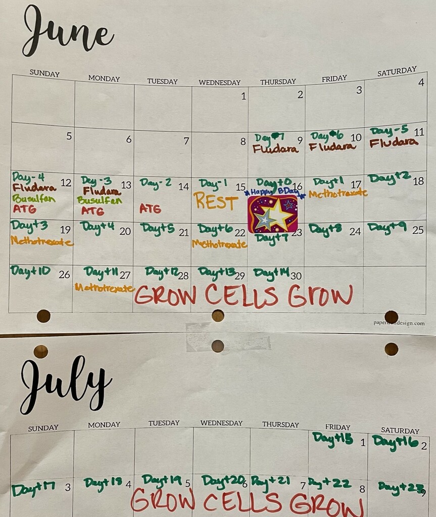 Here’s a rough estimate of my calendar over the next 4-weeks. You’ll notice we’re counting down to Day “0”. That’s when I get the new stem cells from my donor. Then we start building back up.