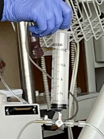 Due to scheduling issues during the Pandemic, they switched to mostly freezing the stem cells. Applying the frozen cells involves letting them thaw and injecting them via syringe into an IV stream of normal saline. This is not your normal syringe, though. The two syringes my stems came in held 2 ounces each and were fully packed.